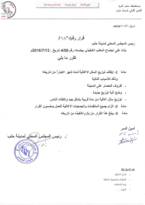 قرار من المجلس المحلي بإيقاف توزيع السلل الغذائية لمدة شهر اعتباراً من تاريخ هذا القرار