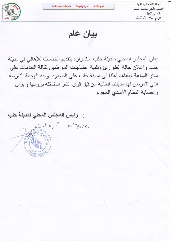 المجلس المحلي لمدينة حلب يعلن استمراره في تلبية حاجات المواطنين ويعلن حالة الطوارئ