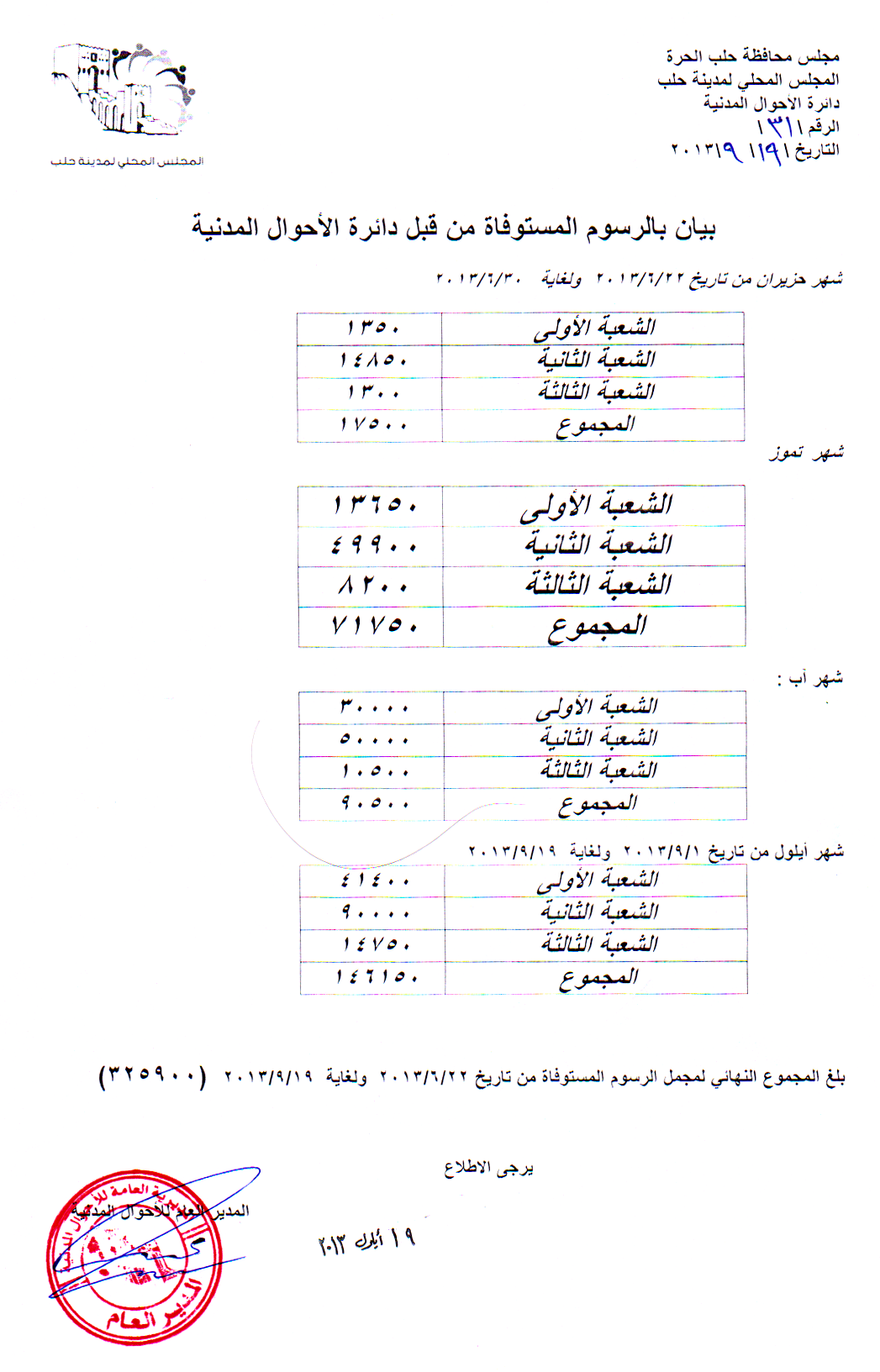 بيان من المجلس المحلي لمدينة حلب بالرسوم المستوفاة من قبل دائرة الأحوال المدنية من تاريخ 22 / 6 / 2013 ولغاية 19 / 9 / 2013 م