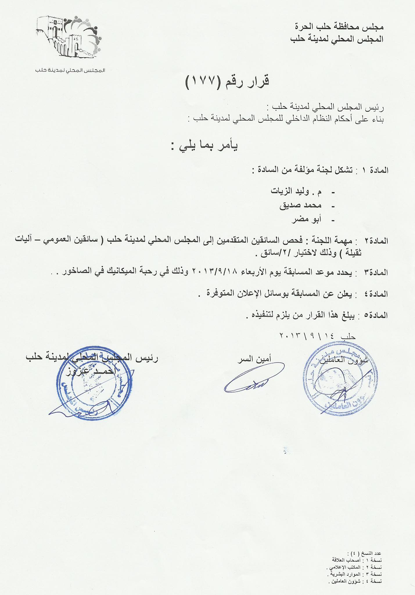 قرار بشأن تشكيل لجنة فحص السائقين المتقدمين الى المجلس المحلي لمدينة حلب