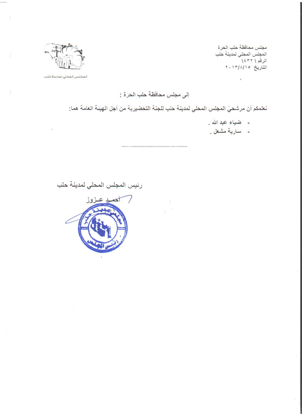 كتاب من المجلس المحلي لمدينة حلب بشأن اعتماده أسماء المرشحين للجنة التحضيرية من أجل الهيئة العامة