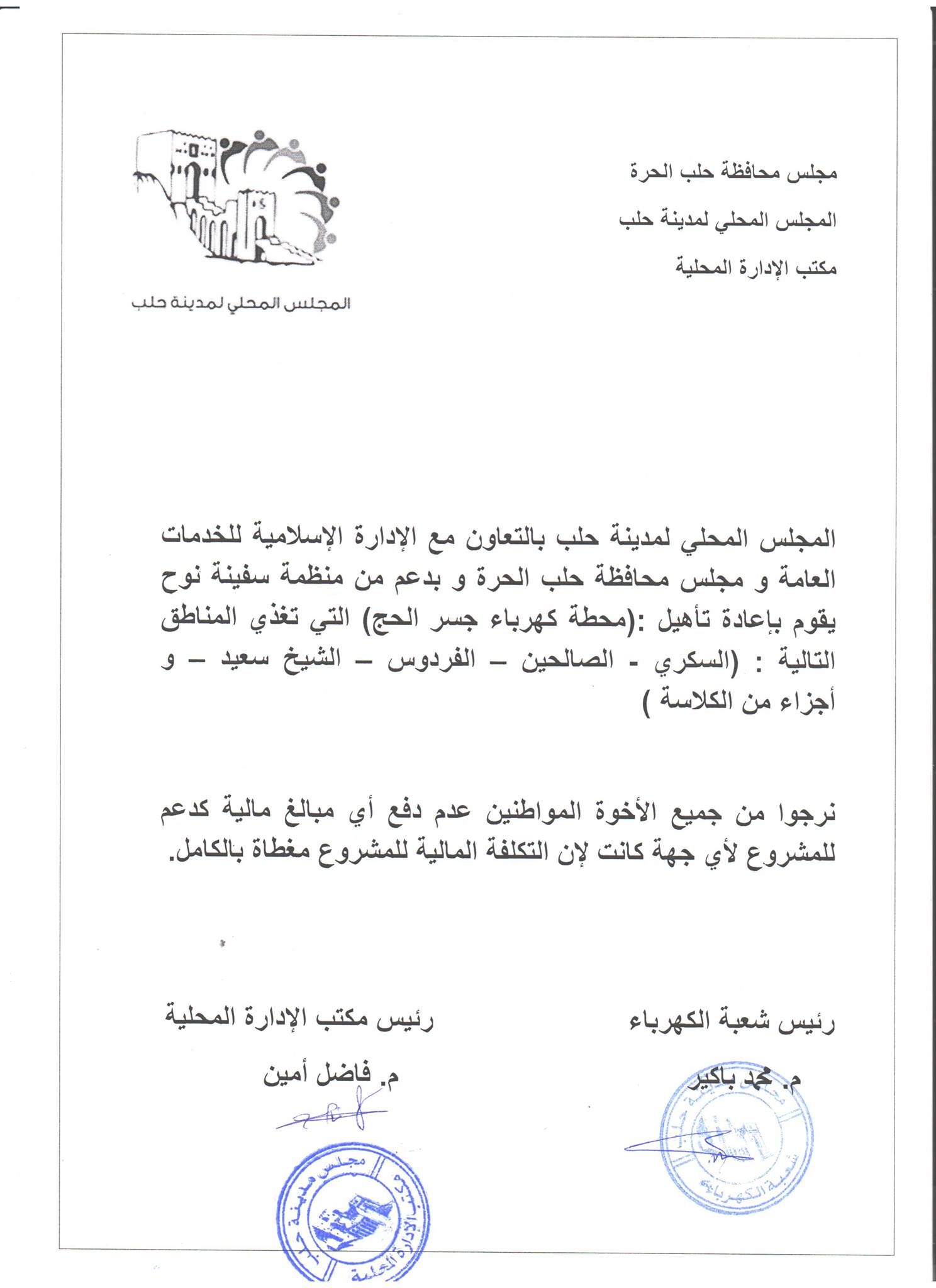 المجلس المحلي لمدينة حلب بالتعاون مع الإدارة الإسلامية للخدمات العامة و مجلس محافظة حلب الحرة و بدعم من منظمة سفينة نوح يقوم بإعادة تأهيل :(محطة كهرباء جسر الحج) التي تغذي المناطق التالية : (السكري - الصالحين – الفردوس – الشيخ سعيد – و أجزاء من الكلاسة )