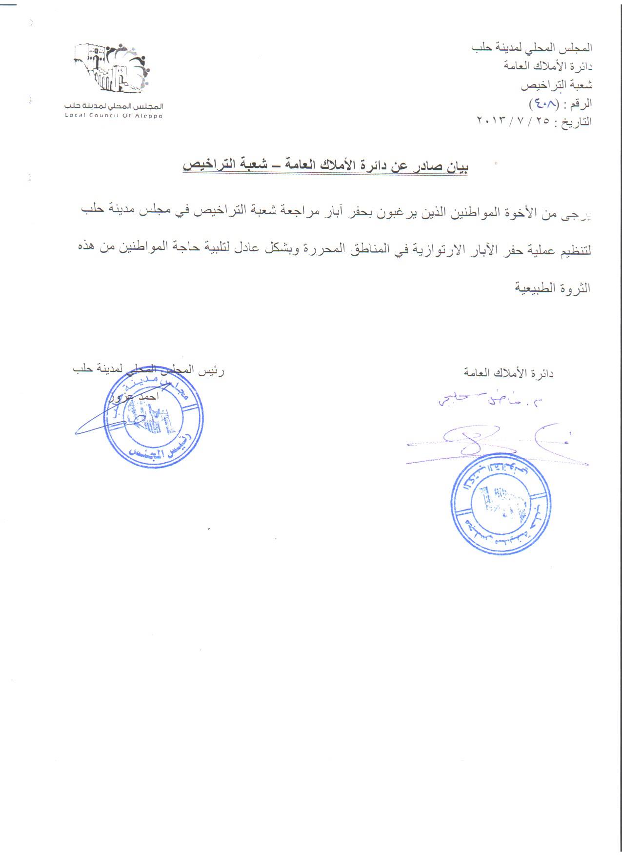 يرجى من الأخوة المواطنين الذين يرغبون بحفر آبار مراجعة شعبة التراخيص في مجلس مدينة حلب لتنظيم عملية حفر الآبار الارتوازية في المناطق المحررة وبشكل عادل لتلبية حاجة المواطنين من هذه الثروة الطبيعية