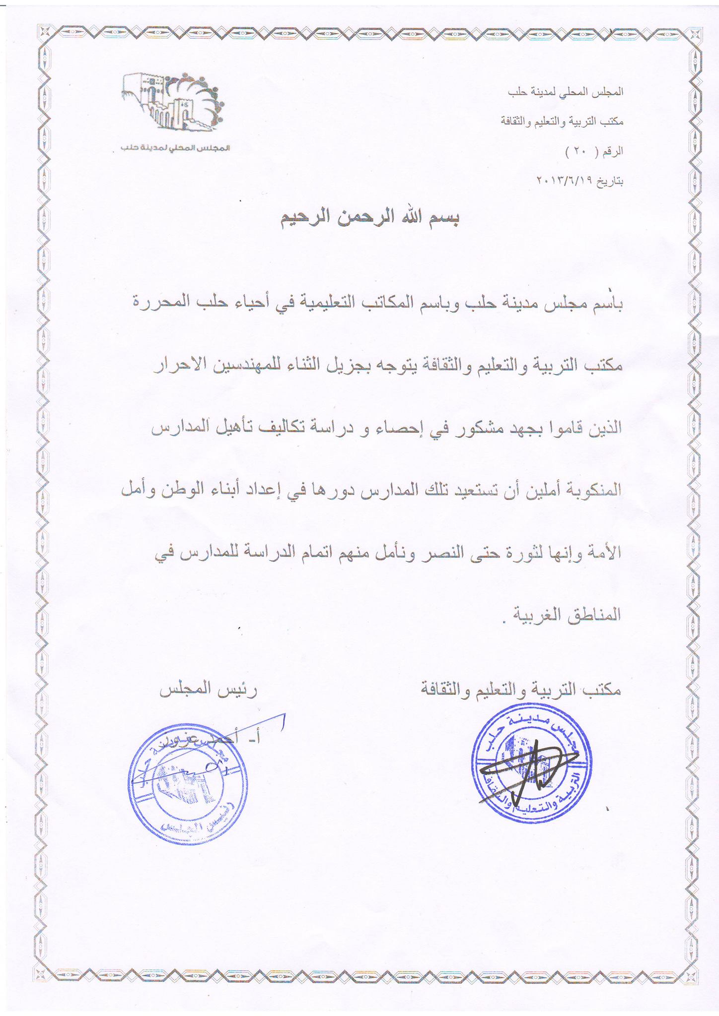 باسم مجلس مدينة حلب وباسم المكاتب التعليمية في أحياء حلب المحررة مكتب التربية والتعليم والثقافة يتوجه بجزيل الثناء للمهندسين الاحرار الذين قاموا بجهد مشكور في إحصاء و دراسة تكاليف تأهيل المدارس المنكوبة أملين أن تستعيد تلك المدارس دورها في إعداد أبناء الوطن وأمل الأمة وإنها لثورة حتى النصر ونأمل منهم اتمام الدراسة للمدارس في المناطق الغربية .