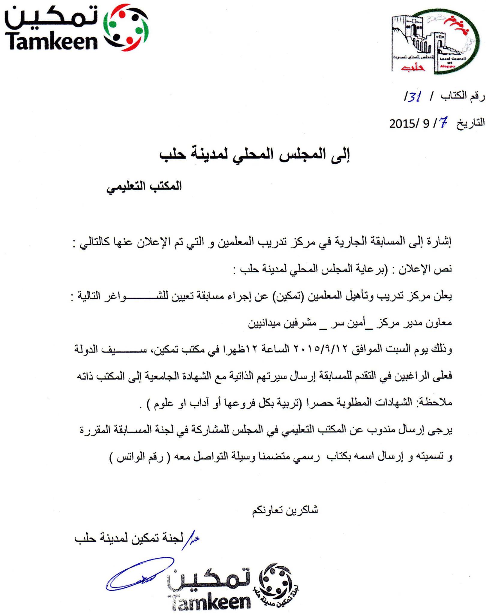 بيان بشأن إعلام المجلس المحلي لمدينة حلب بإجراء مركز تدريب وتأهيل المعلمين التابع للجنة تمكين مسابقة تعين شواغر
