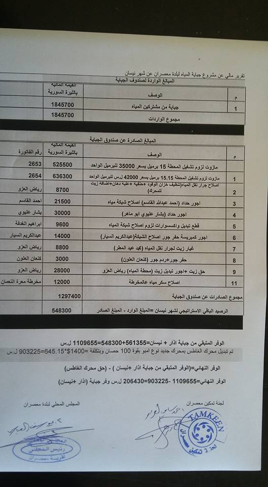 تقرير مالي عن مشروع جباية المياه لبلدة معصران عن شهر نيسان 2016