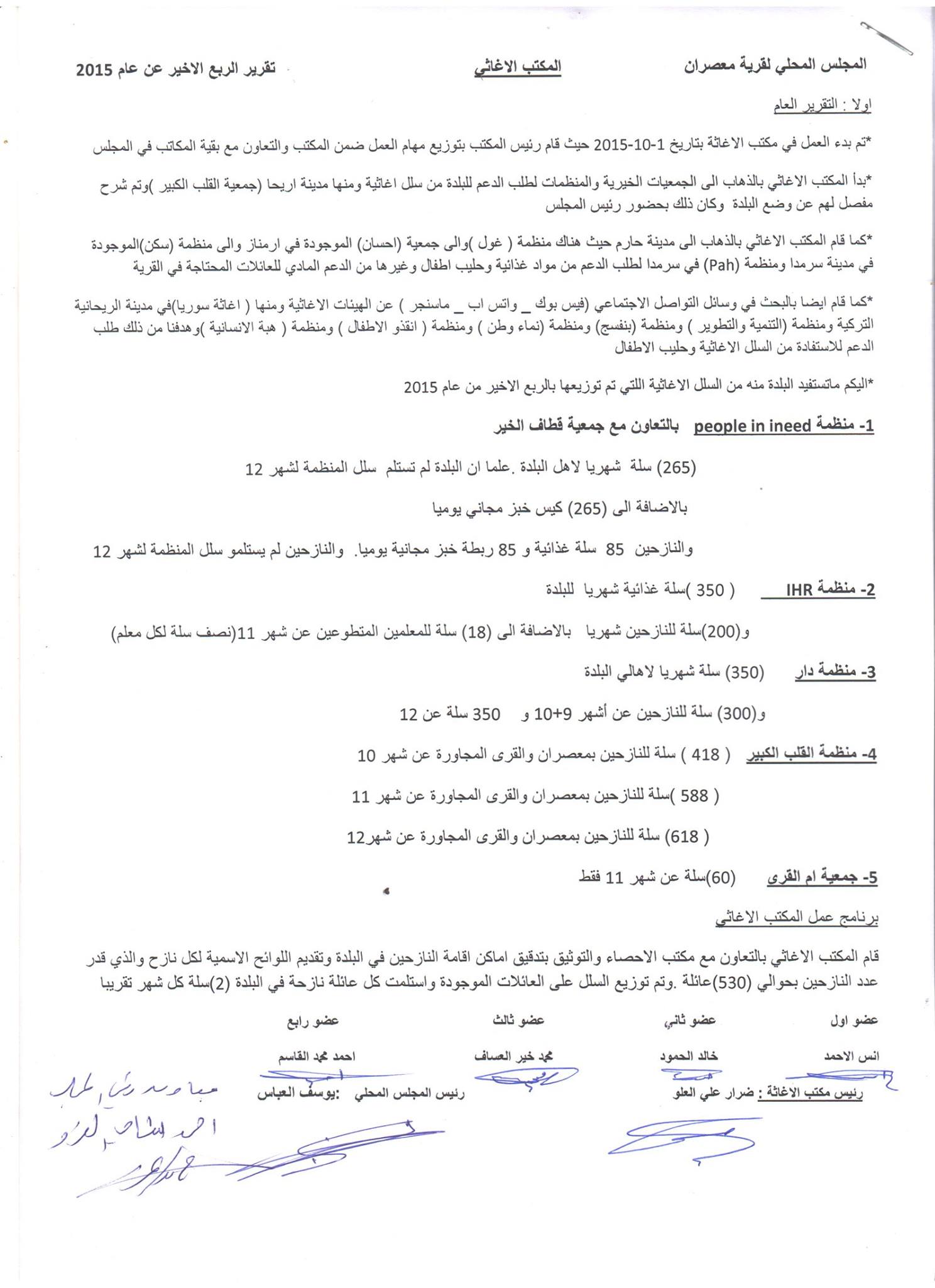 تقرير عمل المكتب الاغاثي في المجلس المحلي لقرية مصران خلال الربع الأخير من عام 2015