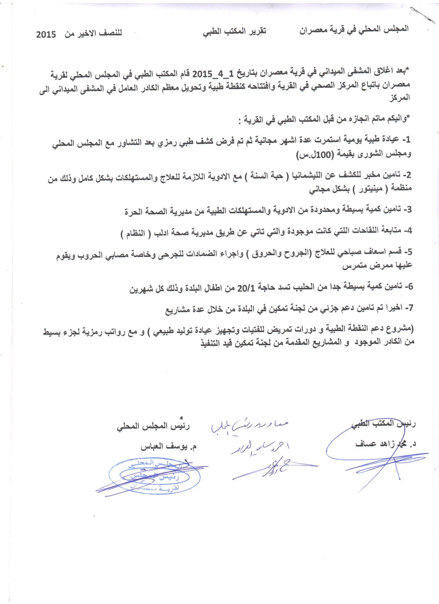 تقرير عمل المكتب الطبي في المجلس المحلي لقرية معصران خلال الربع الاخير من عام 2015