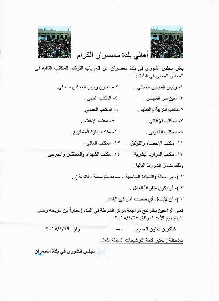 مجلس الشورى في بلدة معصران يعلن فتح باب الترشح للعمل في المجلس المحلي في البلدة
