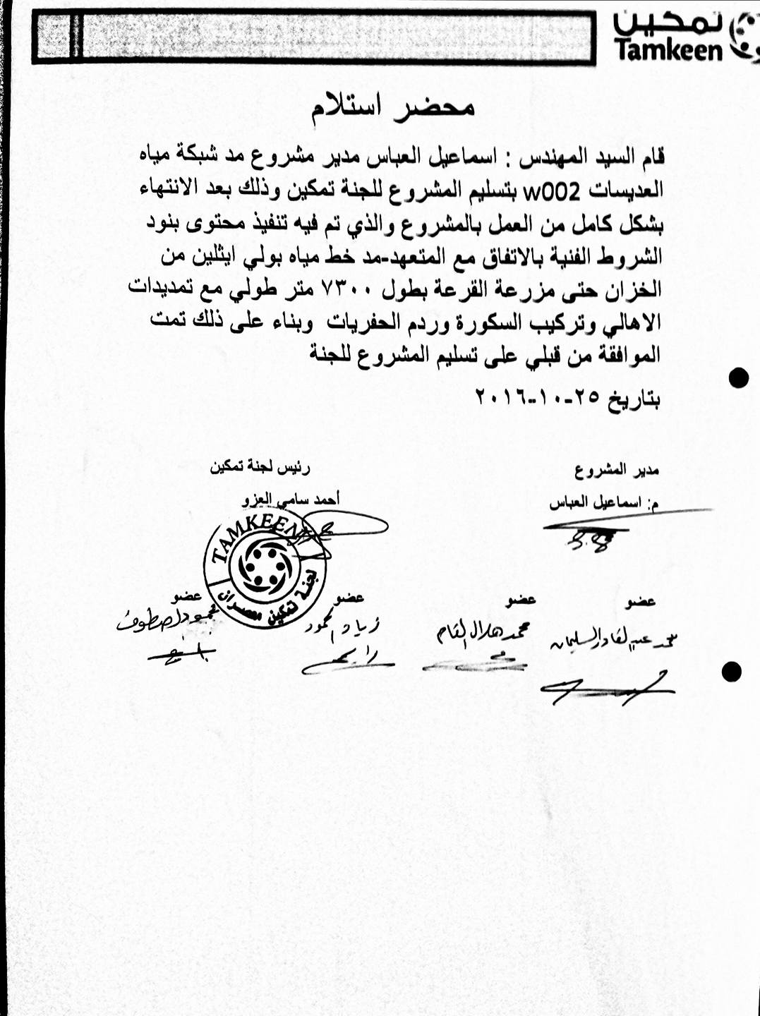 بيان حول محضر تسليم مشروع مد شبكة المياه للجنة تمكين
