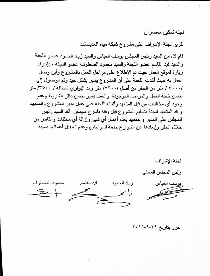 تقرير لجنة تمكين معصران حول مشروع شبكة مياه العديسانت