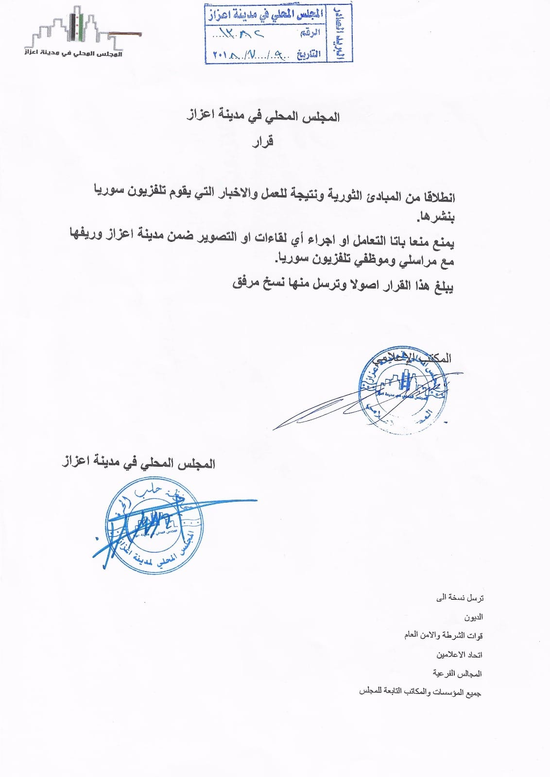 تعميم من المجلس المحلي لمدينة إعزاز بمنع التعامل مع أو إجراء أي لقاء أو التصوير ضمن مدينة اعزاز مع مراسلي وموظفي تلفزيون سوريا