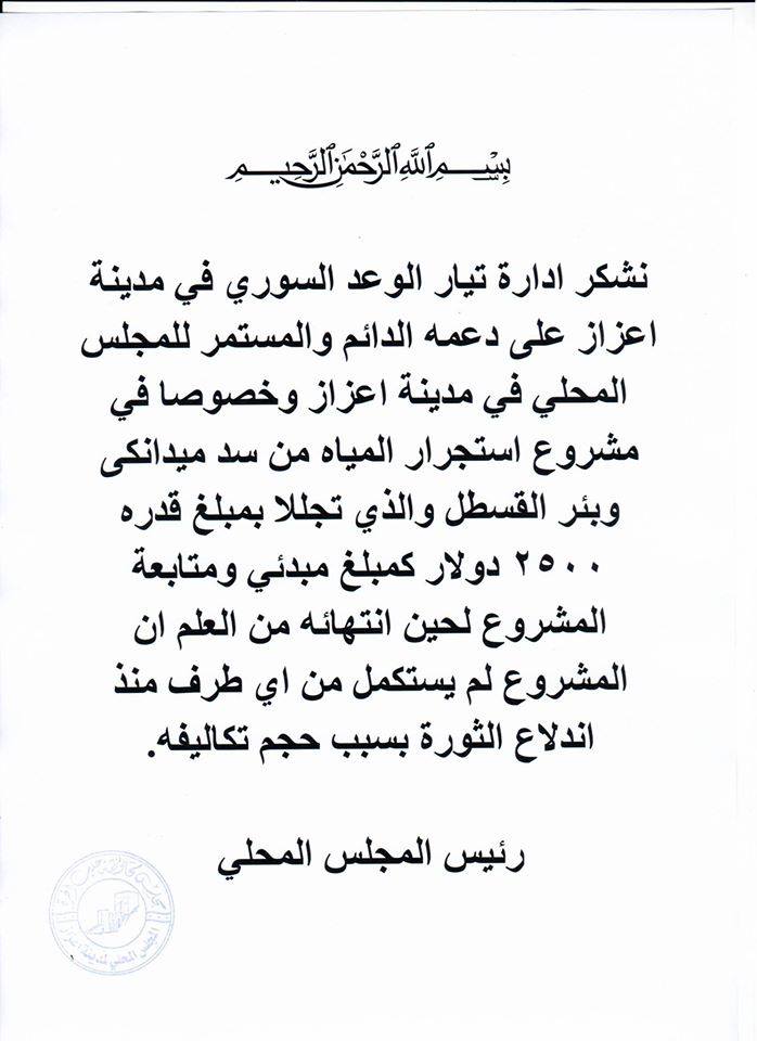 بيان شكر من المجلس المحلي في مدينة اعزاز لتيار الوعد السوري على تقديمه مبلغ مالي لشراء على دعمه المستمر للمجلس وخصوصاً دعمه لمشروع تجهيز مياه سد ميدانكي