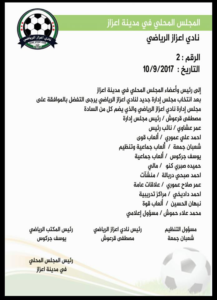 بيان من نادي اعزاز الرياضي حول انتخابات مجلس الإدارة التي جرت ويطلب من المجلس المحلي الموافقة على القائمة