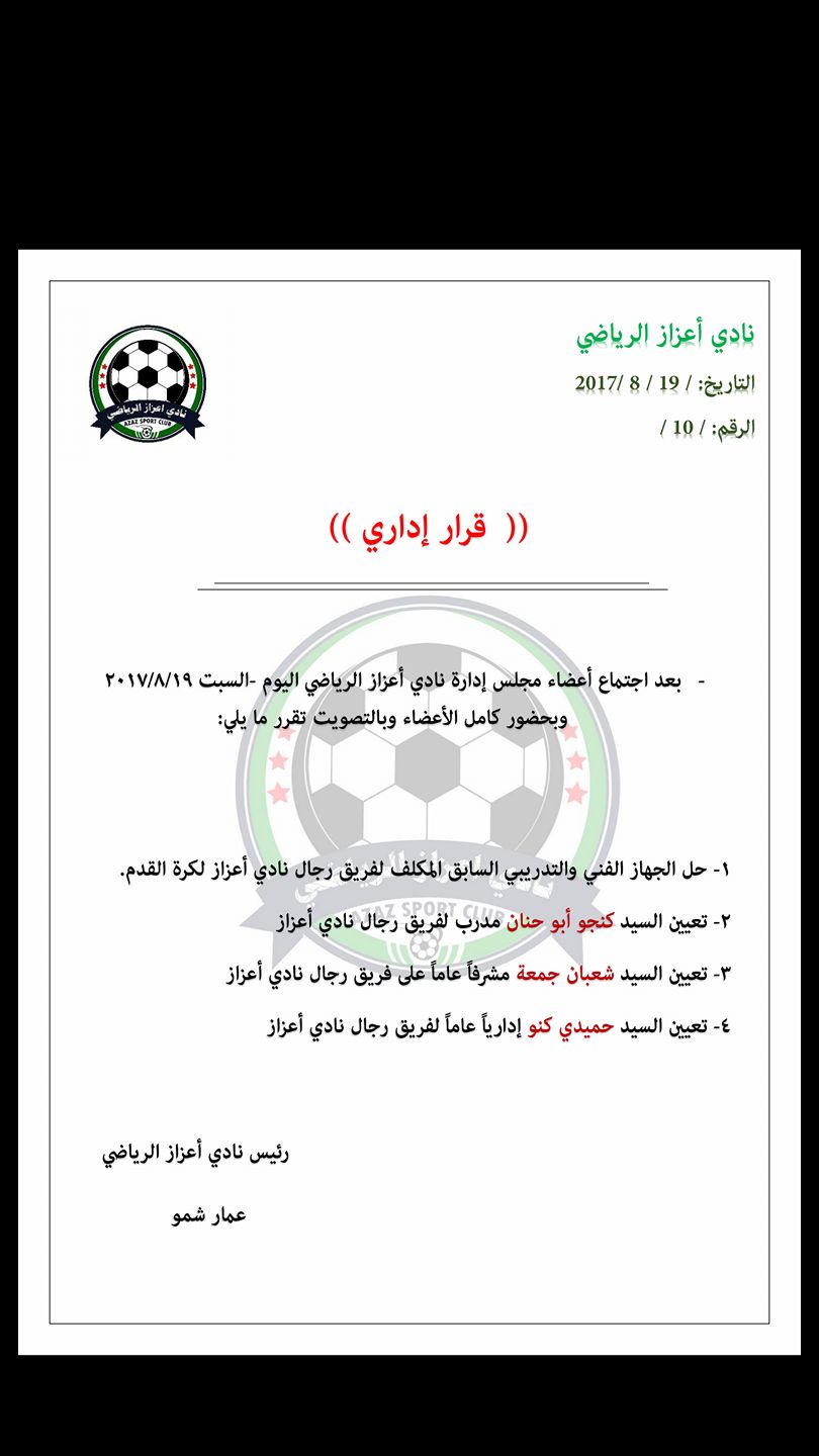 قرار إداري صادر عن مجلس إدارة نادي اعزاز الرياضي بحل الجهاز الفني والتدريبي السابق