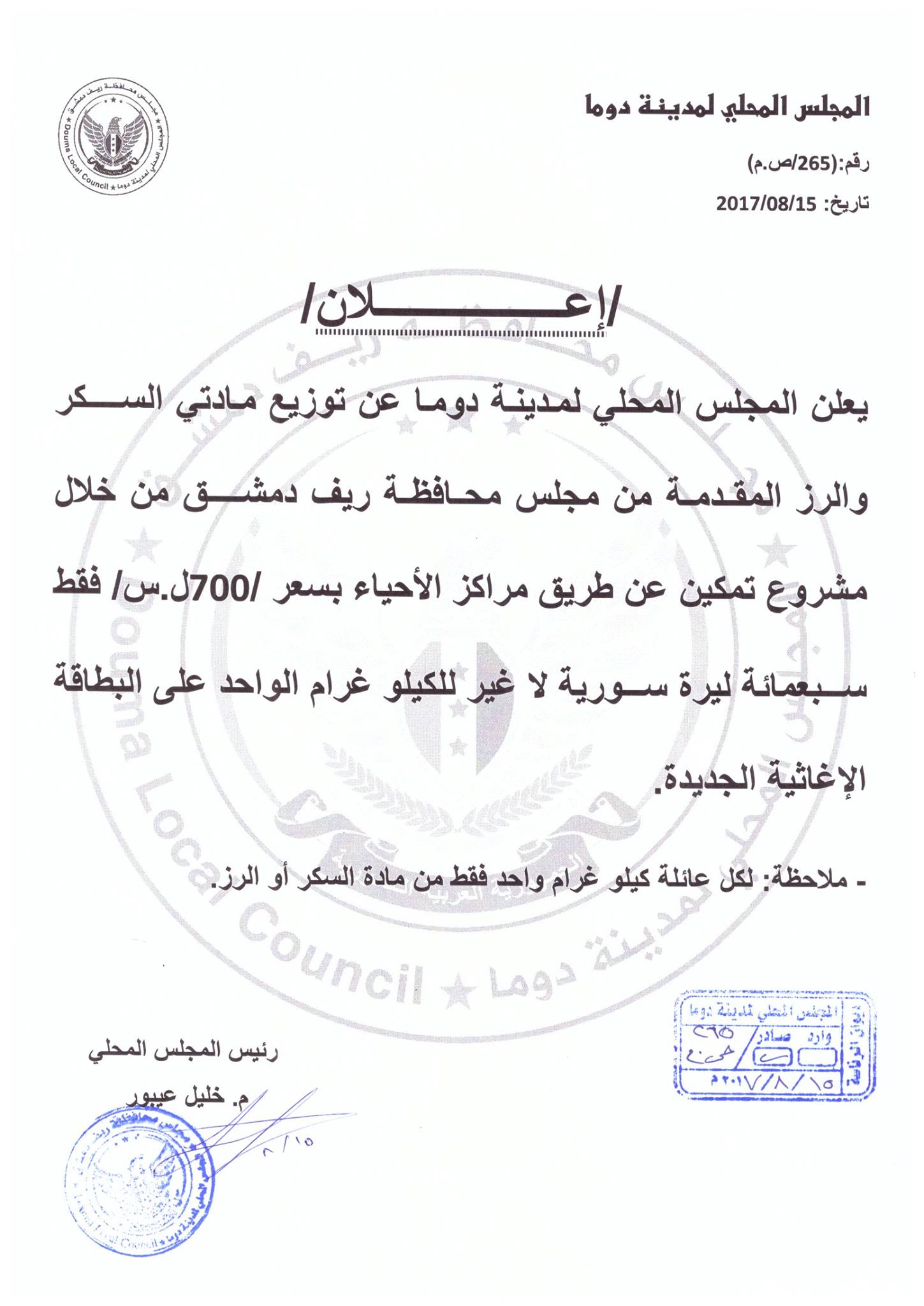 المجلس المحلي لمدينة دوما يعلن عن توزيع مادتي السكر والرز بسعر 700 ليرة للكيلو الواحد على البطاقة الإغاثية الجديدة
