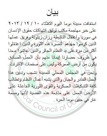 بيان إدانة من المجلس المحلي لمدينة دوما لافتحام مكتب توثيق انتهاكات حقوق الإنسان واختطاف رزان زيتونة وفريق عملها