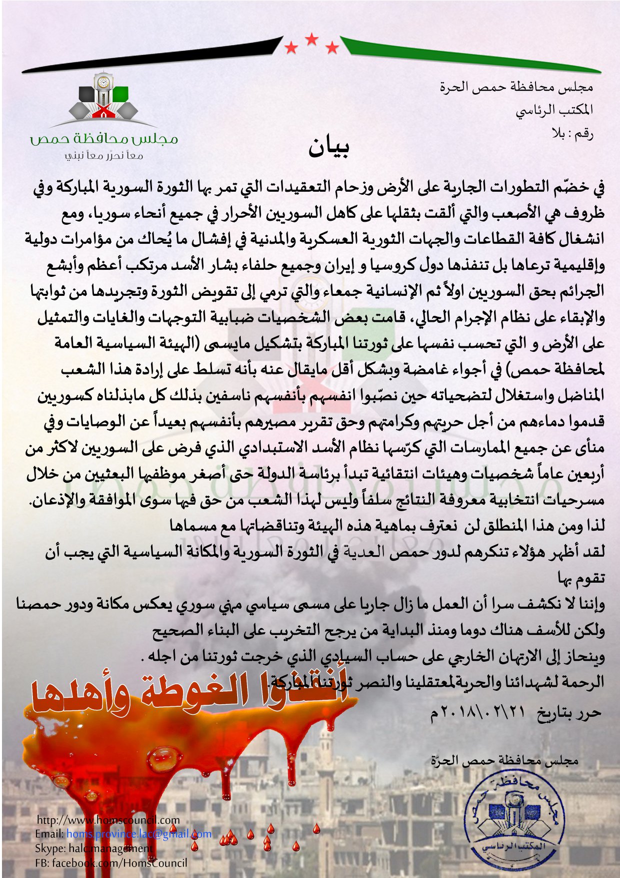 بيان من مجلس محافظة حمص يعلن فيه عدم اعترافه بالهيئة السياسية لمحافظة حمص