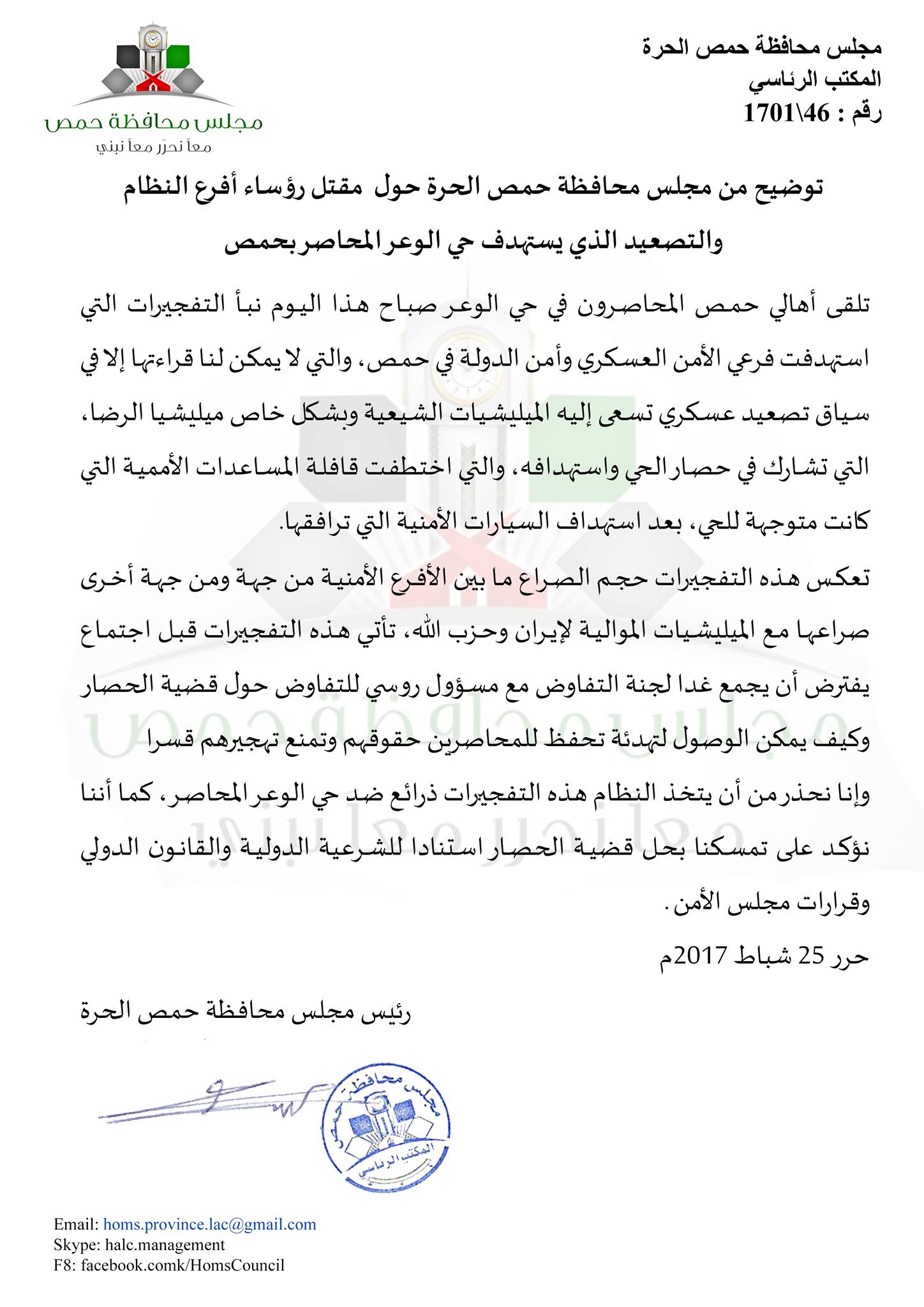 توضيح من مجلس محافظة حمص الحرة حول مقتل رؤساء أفرع النظام والتصعيد الذي يستهدف حي الوعر المحاصر بحمص