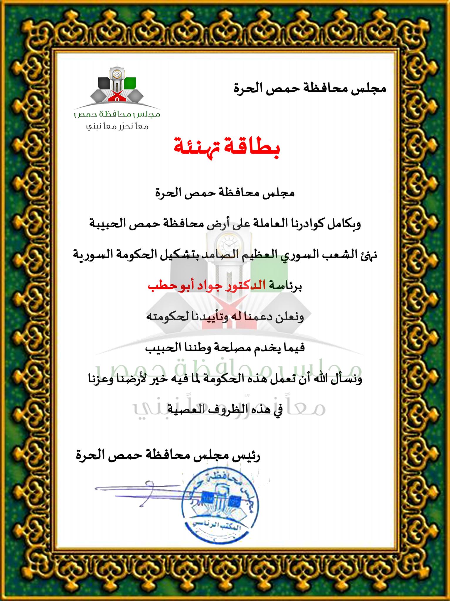 مجلس محافظة حمص الحرة يهنئ الشعب السوري بتشكيل الحكومة السورية برئاسة الدكتور جواد أبو حطب ونعلن دعمه له وتأييده للحكومة