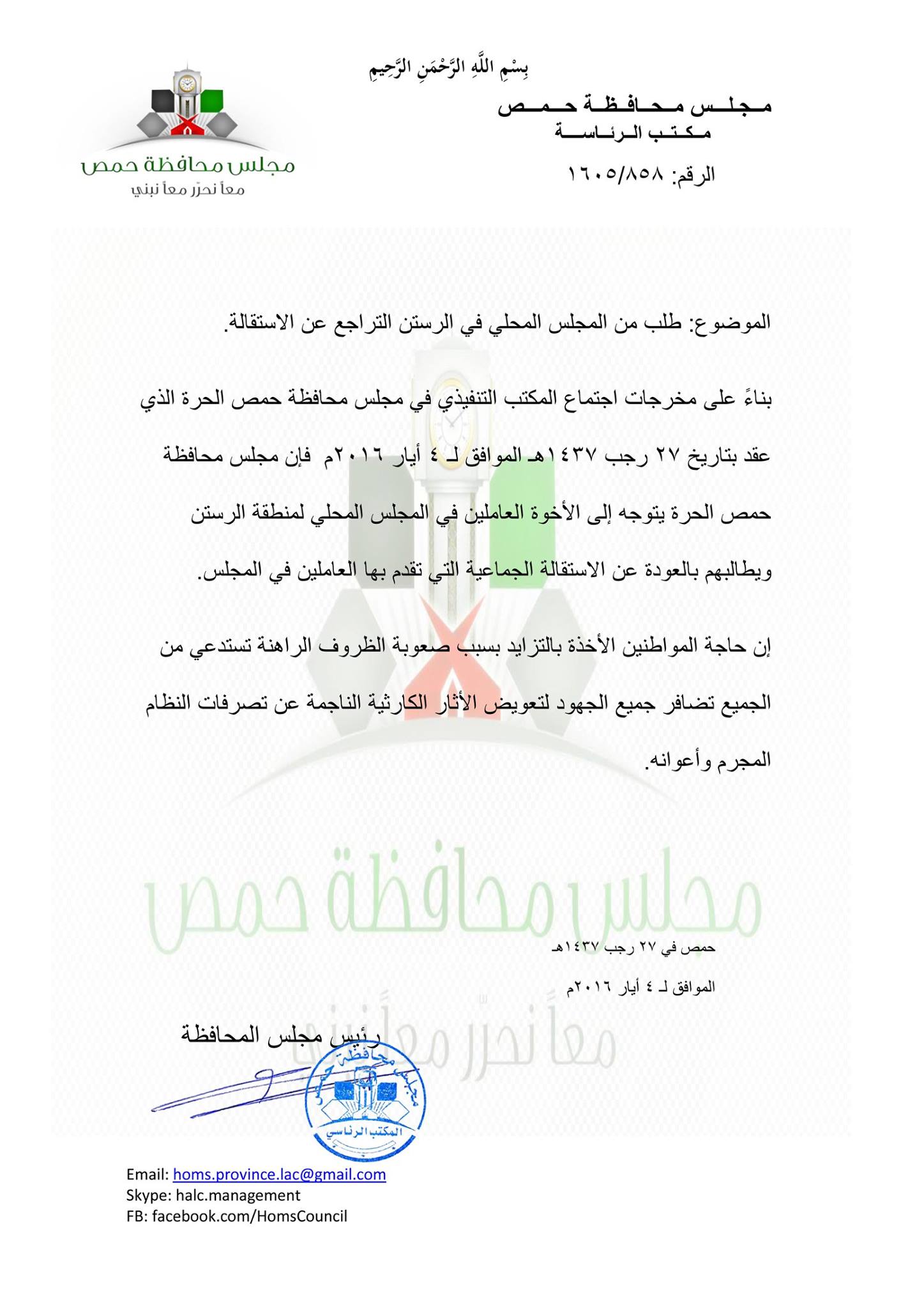 بيان من مجلس محافظة حمص يطلبفيه من العاملين في المجلس المحلي الثوري في مدينة الرستن بالعودة عن الإستقالة الجماعية التي تقدموا بها