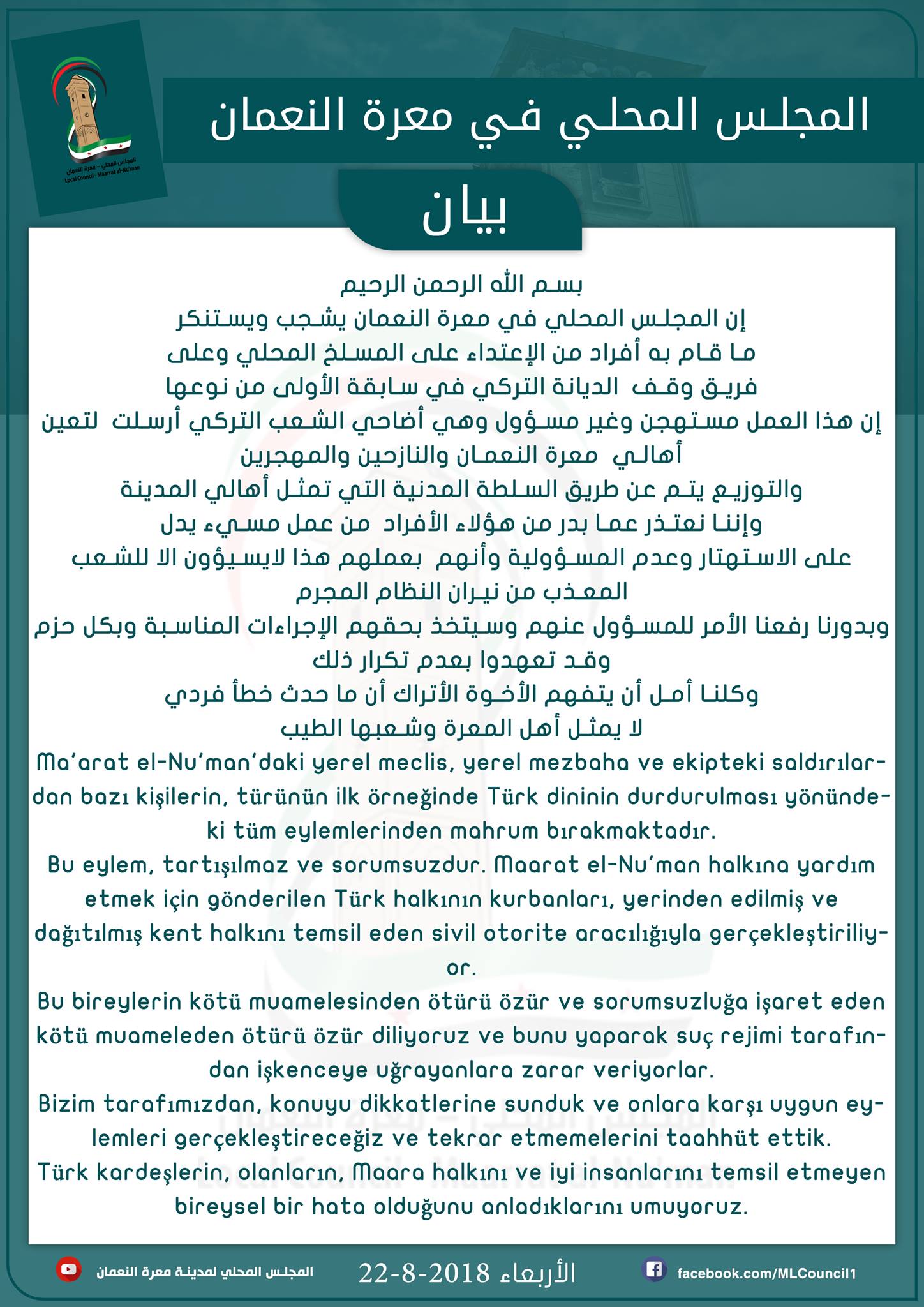إن المجلس المحلي في معرة النعمان يشجب ويستنكر ما قام به أفراد من الإعتداء على المسلخ المحلي وعلى فريق وقف الديانة التركي في سابقة الأولى من نوعها .