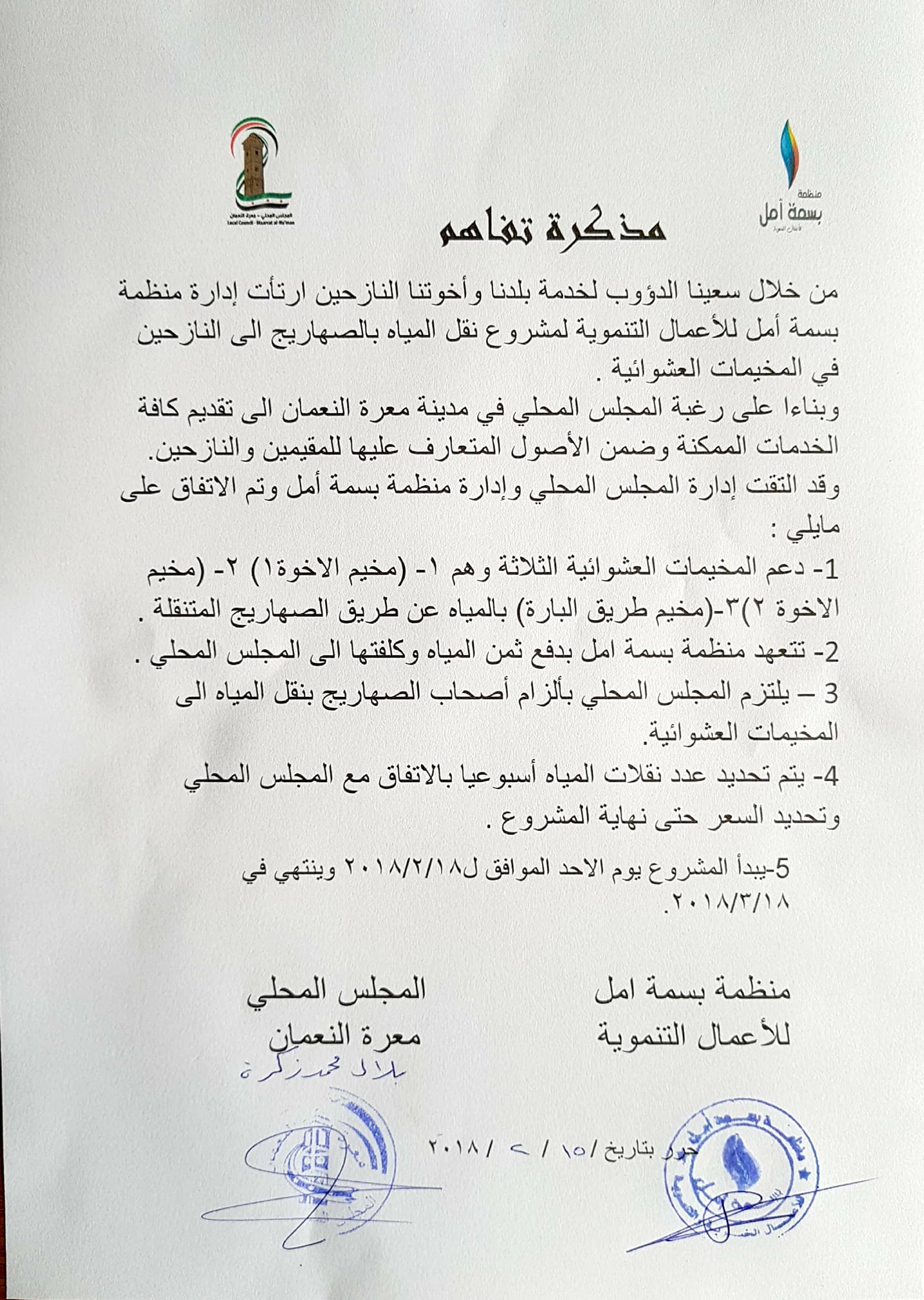 مذكرة تفاهم بين المجلس المحلي ومنظمة بسمة أمل بإيصال المياه عبر الصهاريج مجانناً للمخيمات العشوائية