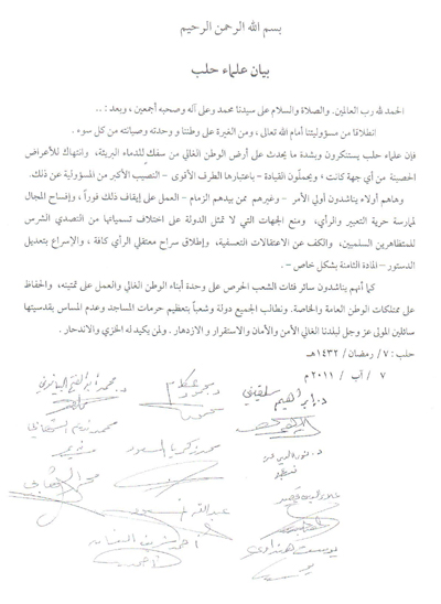 انطلاقاً من مسؤوليتنا أمام الله تعالى، ومن الغيرة على وطننا ووحدته، وصيانته من كل سوء، فإن علماء حلب يستنكرون وبشدّة ما يحدث على أرض الوطن الغالي من سفك ٍللدماء البريئة، وانتهاكٍ للأعراض الحصينة من أيِّ جهةٍ كانت، ويُحملّون القيادة - باعتبارها الطرف الأقوى - النصيبَ الأكبر من المسؤولية عن ذلك.