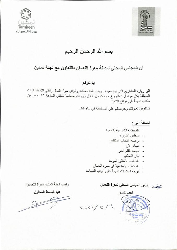 المجلس المحلي في معرة النعمان ولجنة تمكين معرة النعمان يدعوان المواطنين لزيارة المشاريع التي يتم تنفيذها