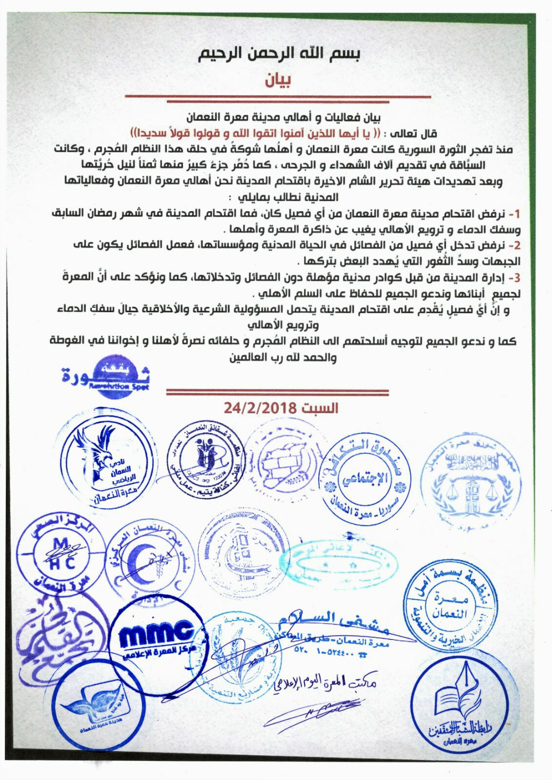 بيان صادر عن أهالي معرة النعمان وفعالياتها المدنية حول تهديد هيئة تحرير الشلم باقتحام المدينة