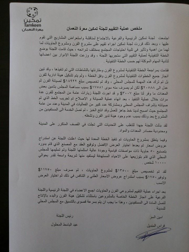 بيان حول عملية التقييم للجنة تمكين معرة النعمان