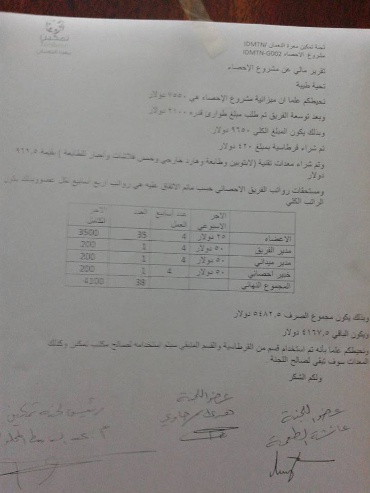 التقرير المالي من لجنة تمكين معرة النعمان عن مشروع الإحصاء