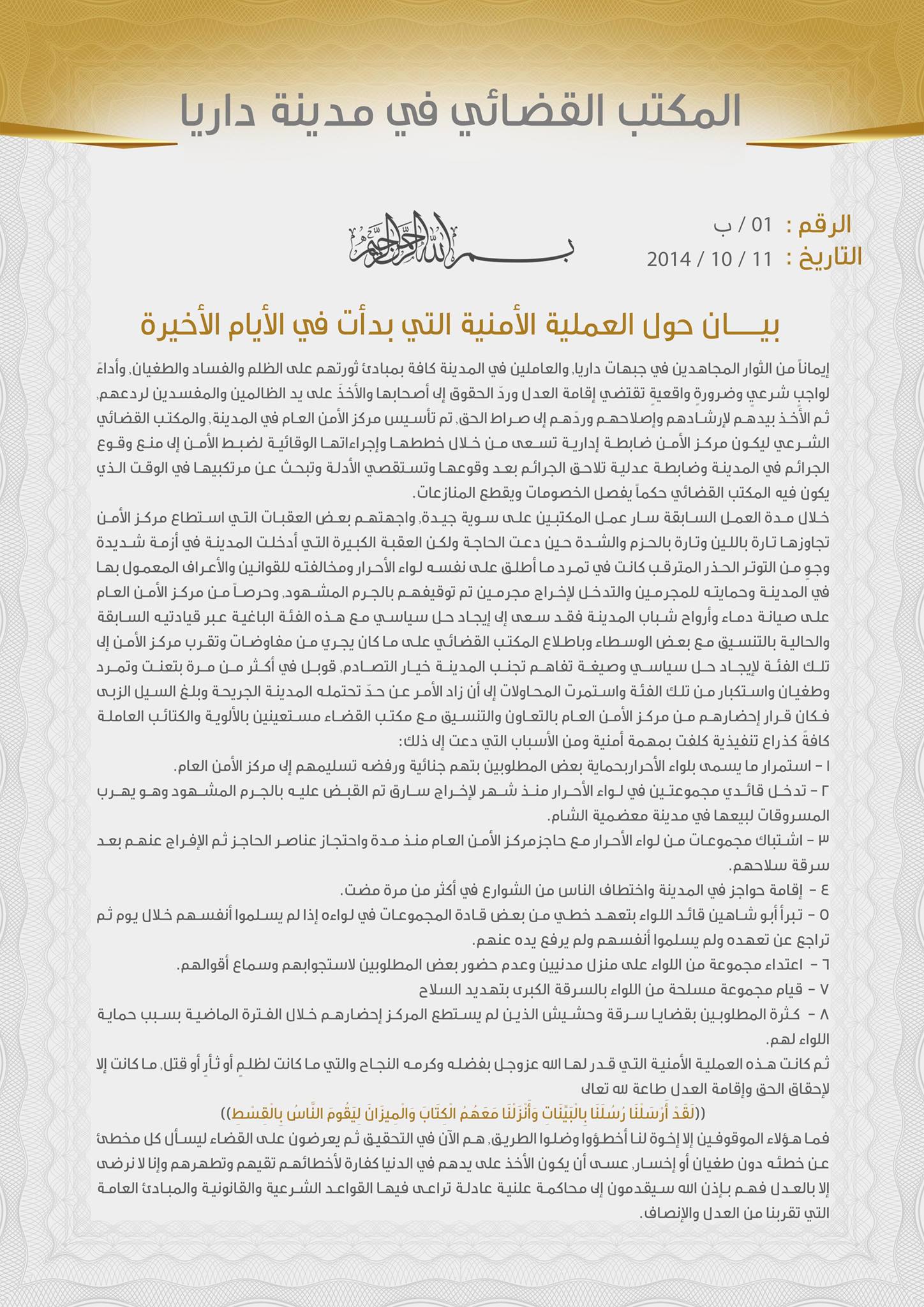 بيان صادر عن مركز الأمن العام في داريا حول العملية الأمنية الجارية في المدينة