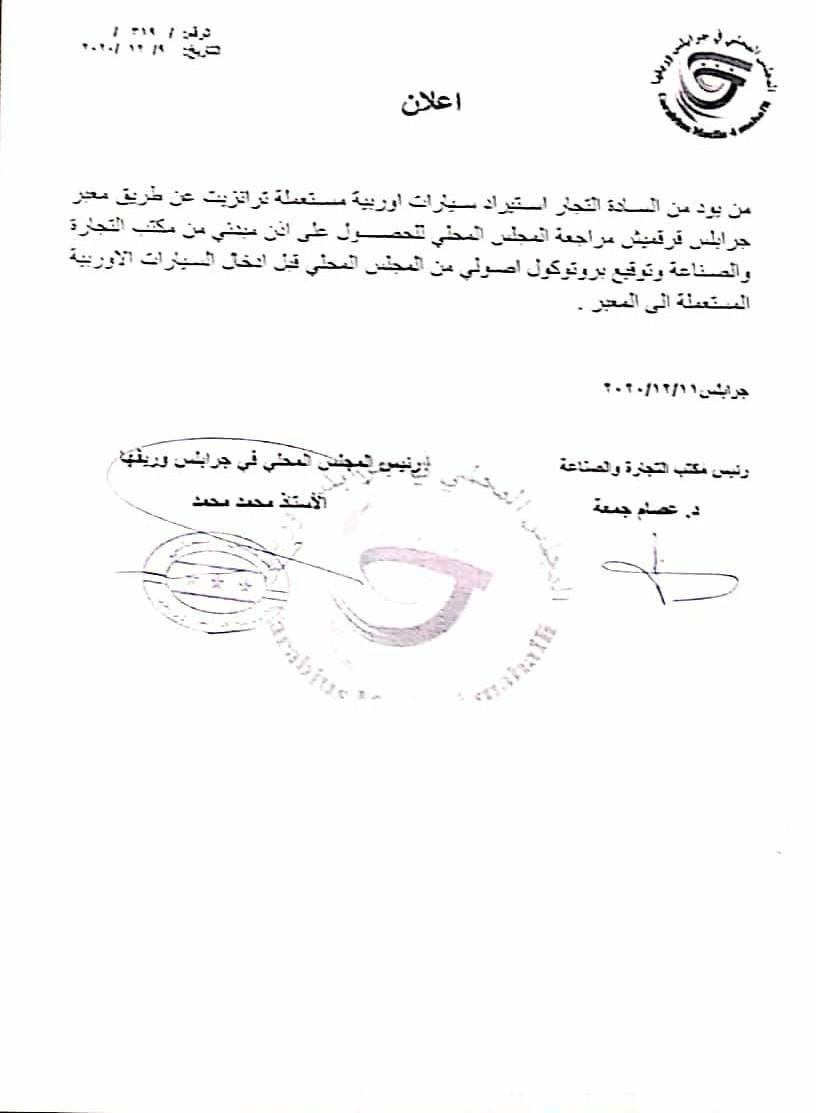 إعلان من المجلس المحلي لمدينة جرابلس وريفها إى التجارة الراغبين باستيراد سيارات مستعملة عن طريق معبر جرابلس قرقميش