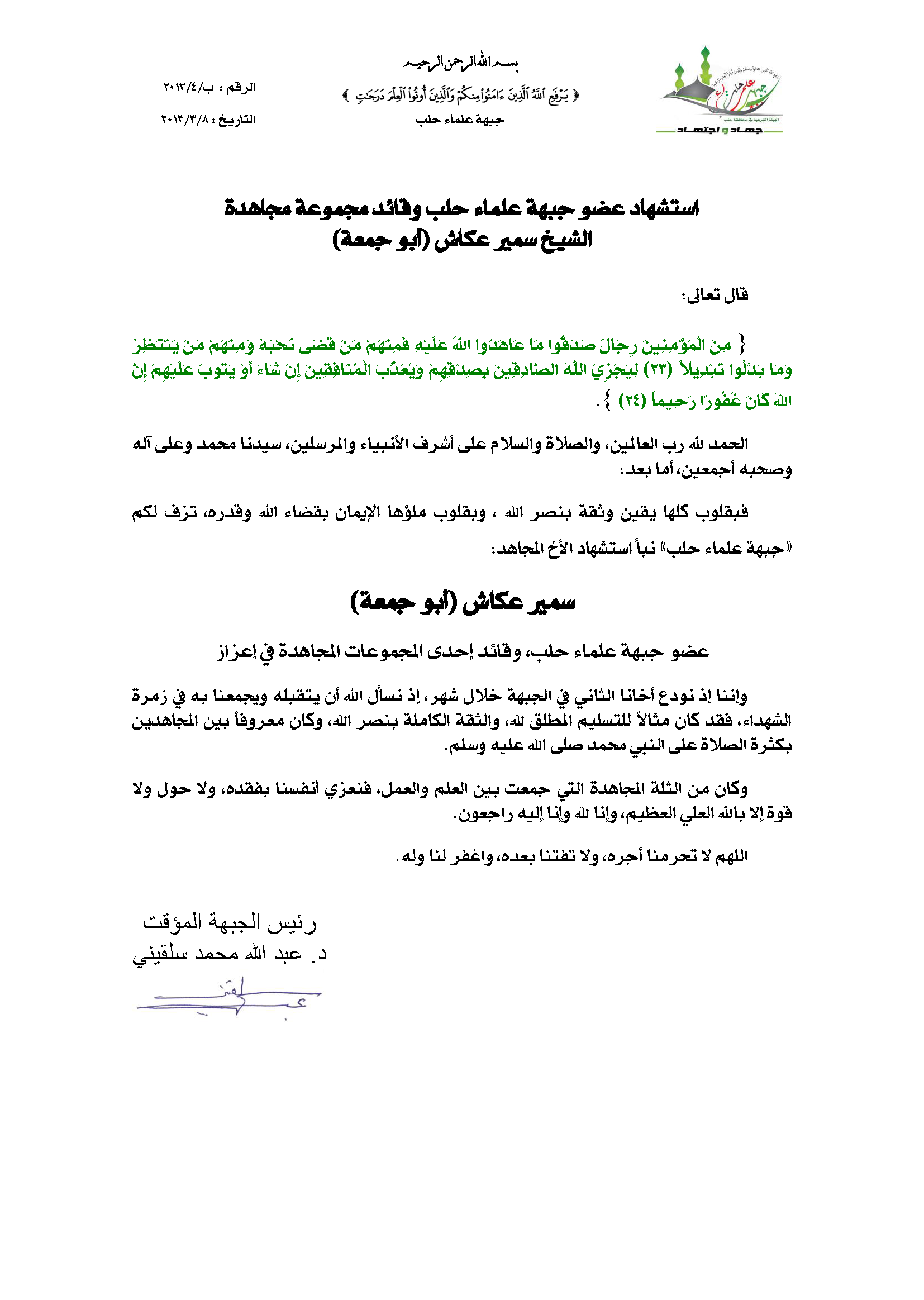 بينا تعزية في سمير عكاش أبو جمعة عضو جبهة علماءحلب وقائد كتيبة محمود عكاش