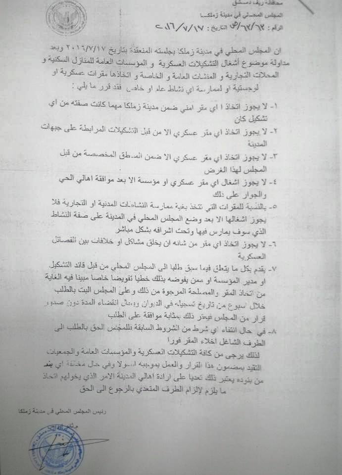 تعميم من المجلس المحلي في مدينة زملكا حول اتخاذ الفصائل العسكرية مقرات لها داخل المدينة
