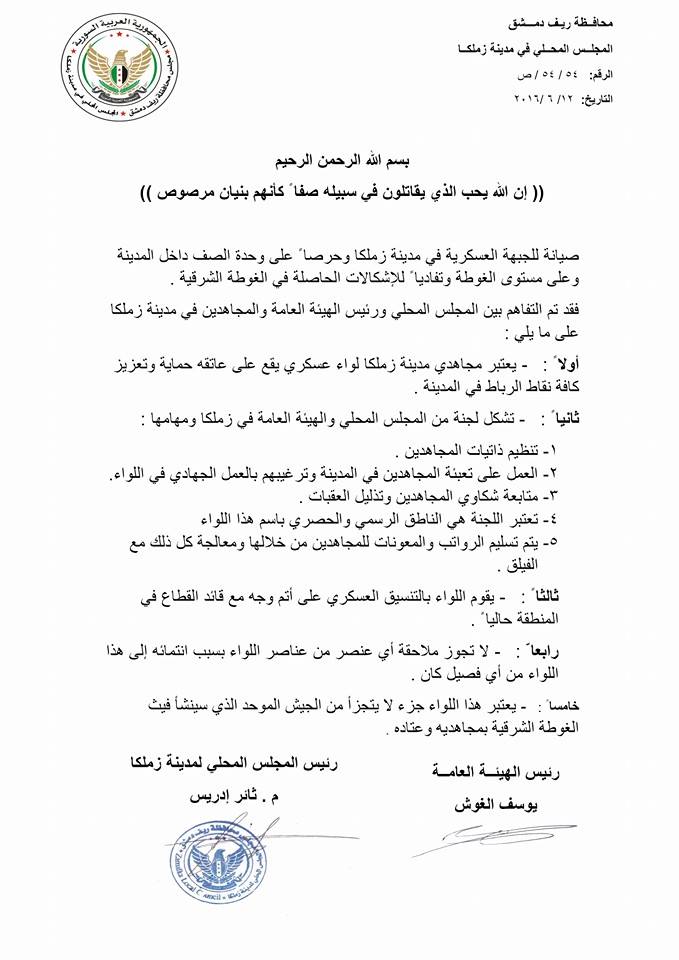 بيان صادر من المجلس المحلي لمدينة زملكا بشأن التفاهم الذي تم التوصل إليه بين المجلس والهيئة العامة ومجاهدي مدينة زملكا