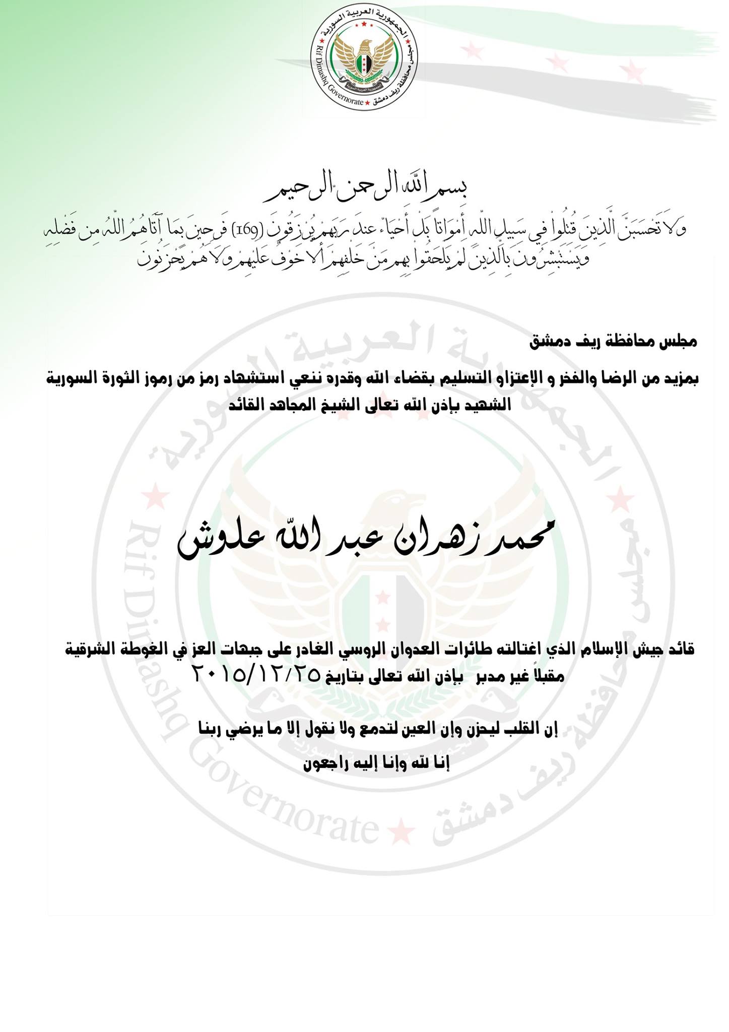 مجلس محافظة ريف دمشق يعزي بالشيخ زهران علوش