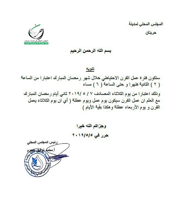 تنويه من المجلس المحلي لمدينة حريتان بشأن تحديد ساعات عمل الفرن الإحتياطي في المدينة في شهر رمضان