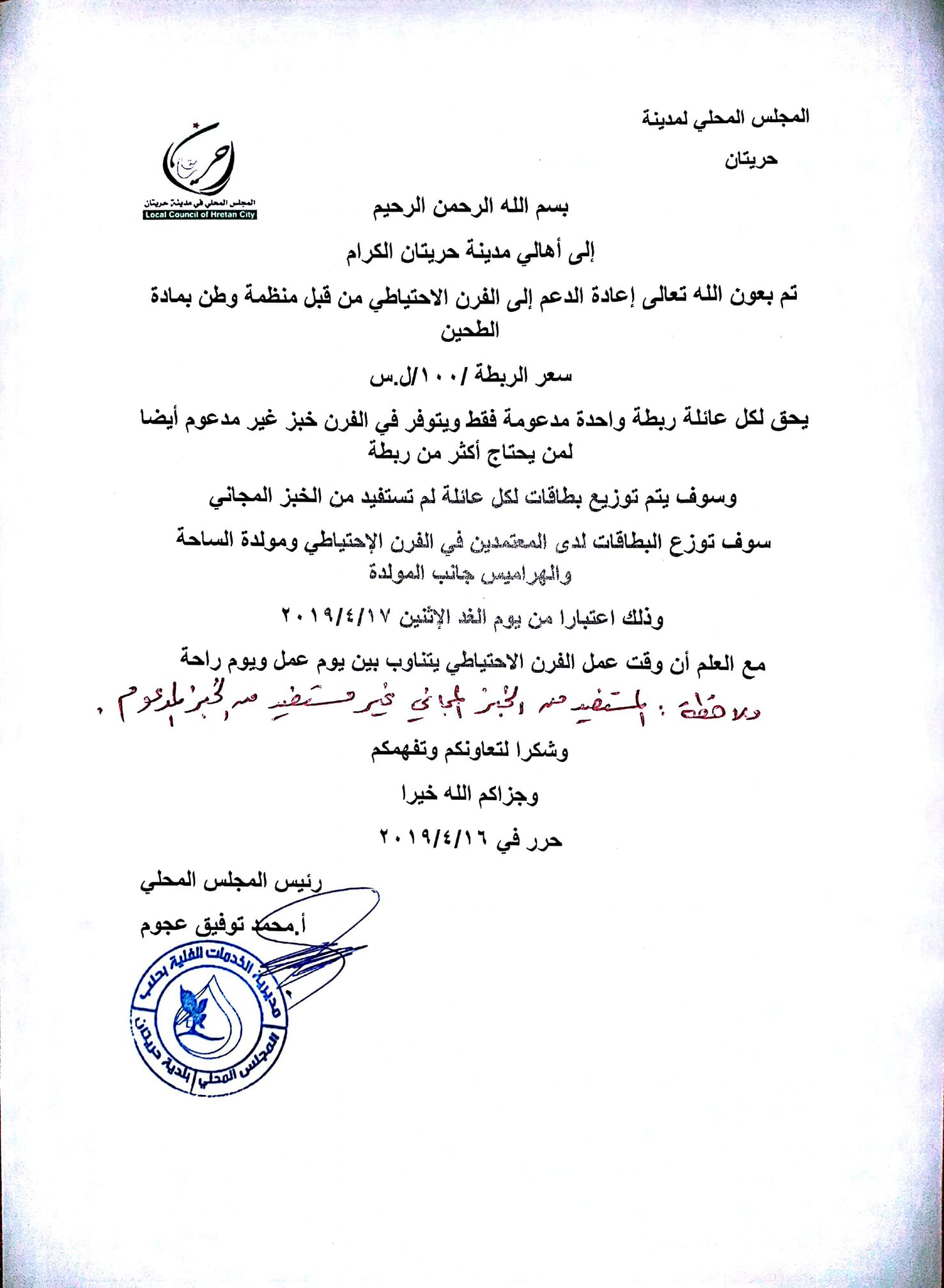 إعلان من المجلس المحلي لمدينة حريتان بشأن إعاة الدعم للفرن الإحتياطي من قبل منظمة وطن
