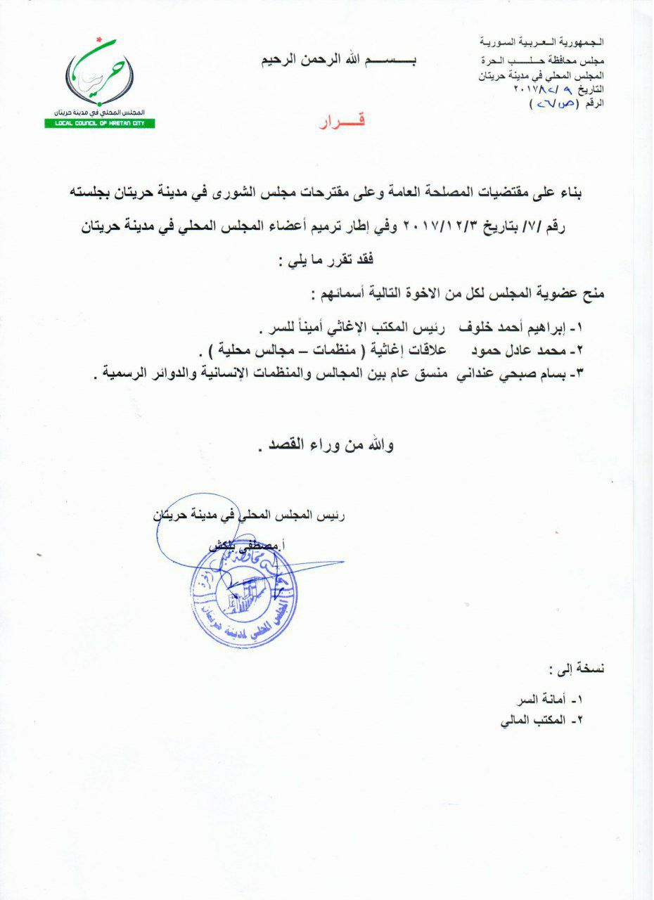 قرار إداري من المجلس المحلي لمدينة حريتان بتعيين أعضاء جدد في المجلس المحلي