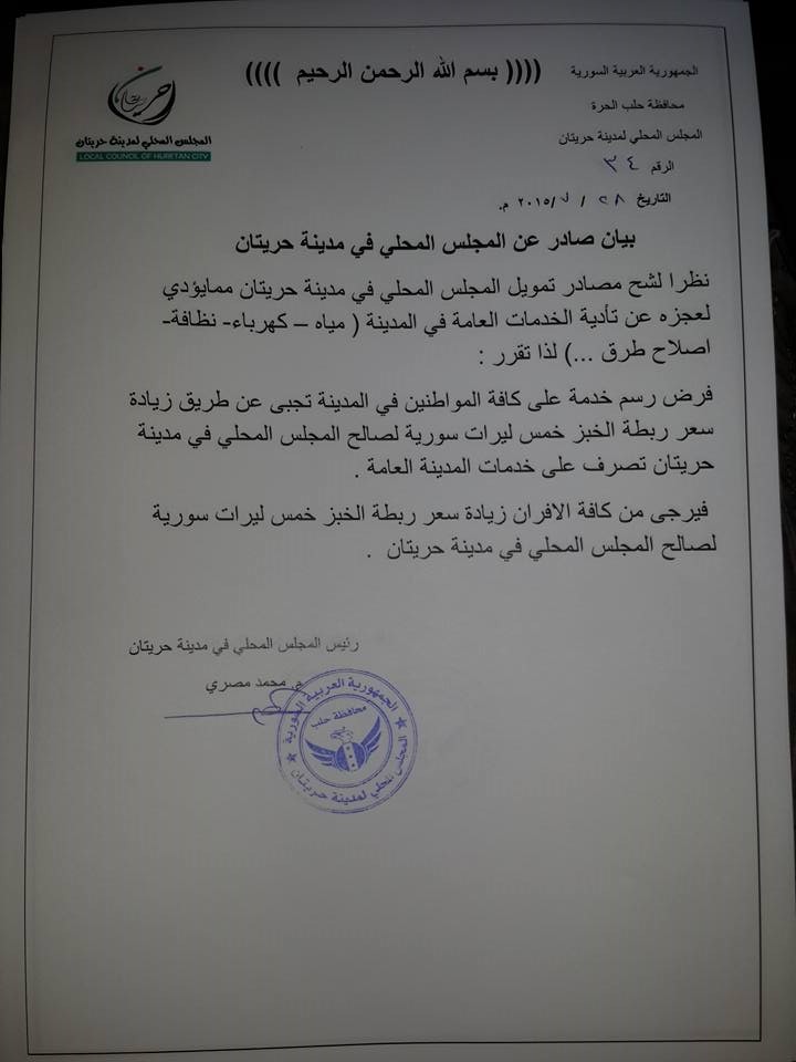 قرار من المجلس المحلي لمدينة حريتان بزيادة سعر ربطة الخبز 5 ليرات لصالح المجلس نظراً لشح موارده