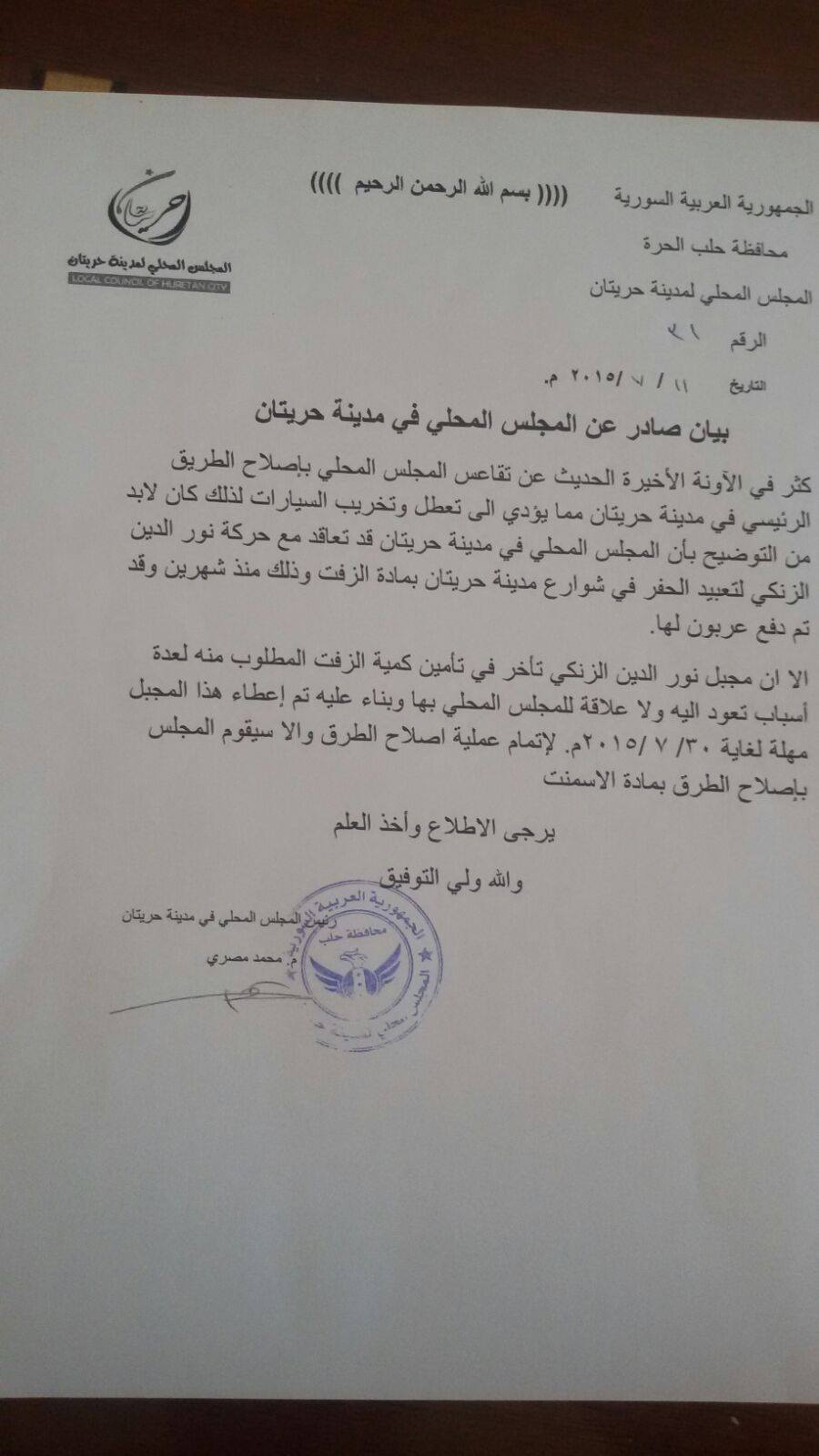 بيان المجلس المحلي لمدينة حريتان بخصوص التأخر في إصلاح الشارع الرئيسي في المدينة