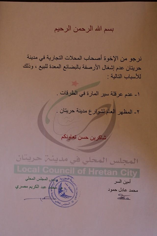 تعميم من المجلس المحلي لمدينة حريتان بشأن أصحاب البسطات وشاغلي الطرقات