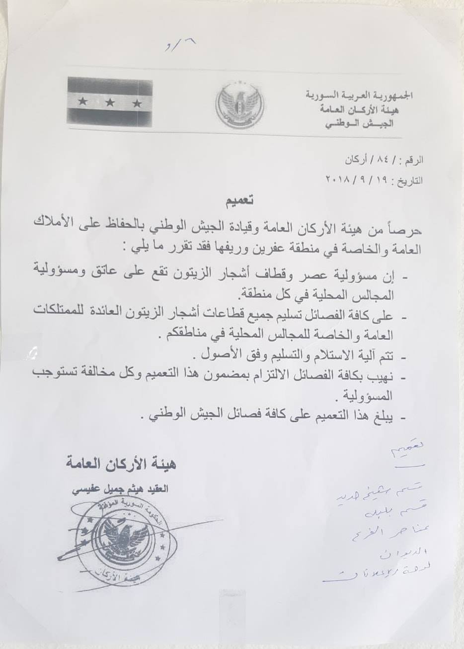 تعميم صادر هيئة أركان للجيش الوطني بخصوص موسم الزيتون في عفرين ومناطقها