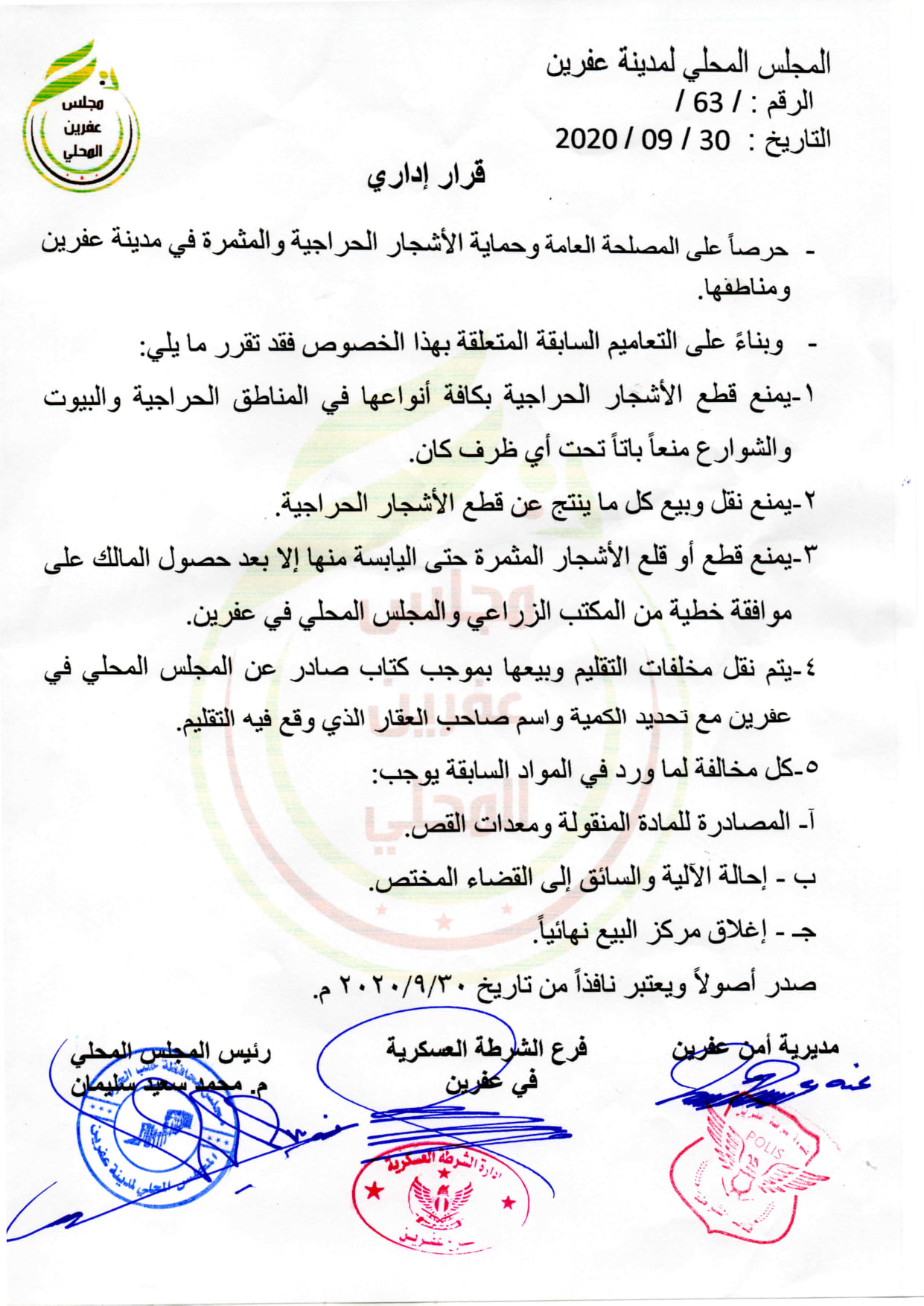 قرار من المجلس المحلي في عفرين حرصاً على المصلحة العامة وحماية الأشجار الحراجية في مدينة عفرين ومناطقها
