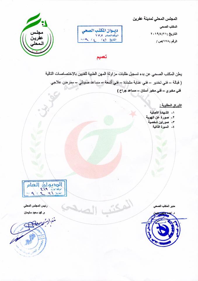 تعميم من المكتب الصحي في المجلس المحلي في عفرين حول بدء التسجيل على طلبات مزاولة المهنة لعدة إختصاصات