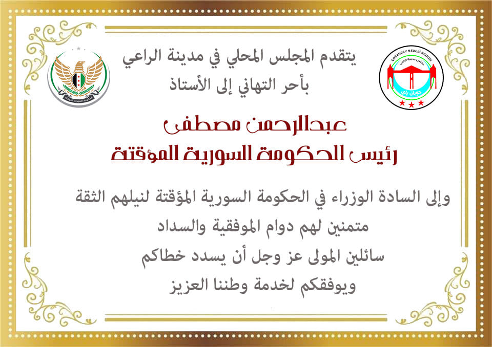 المجلس المحلي في مدينة الراعي يهنئ الأستاذ عبد الرحمن مصطفى ووزراء الحكومة المؤقتة لنيلهم الثقة بتشكيلة الحكومة