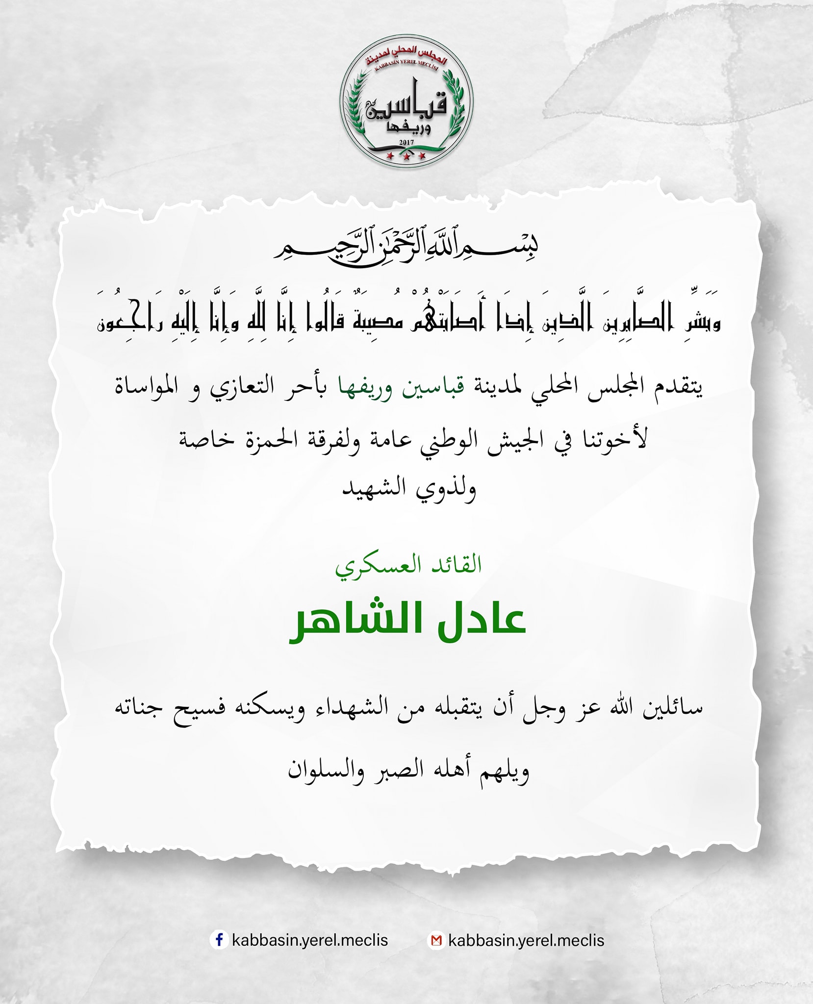 Kabbasin Yerel Meclisi olarak Hamzat grubu komutanlarından Adil Şahir El-Hac Ömer El-Yusuf'un şehadeti sebebiyle kendisine Allah'tan rahmet ailesi ve Hamzat grubuna başsağlığı dileriz.
