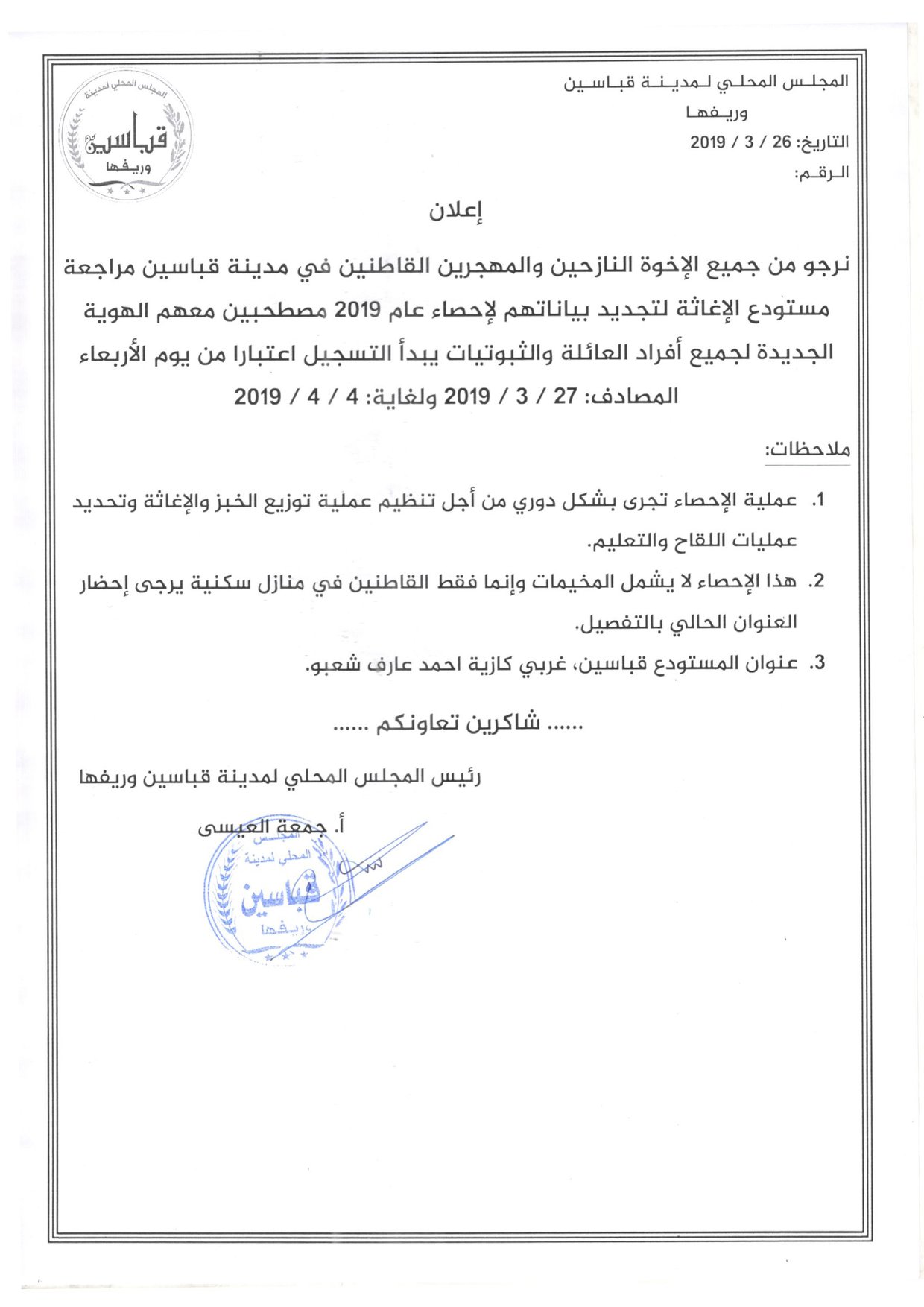 إعلان من المجلس المحلي لمدينة قباسين وريفها إلى النازحين والمهجرين القاطنين في مدينة قباسين مراجعة مستودع الإغاثة لتجديد بياناتهم لإحصاء عام 2019